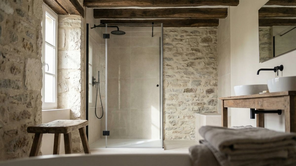 On peut tout à fait avoir une douche confortable, des rangements bien pensés et un chauffage efficace dans une maison en pierre, sans singer un showroom de centre‑ville. Il faut simplement choisir des matériaux compatibles avec le bâti.